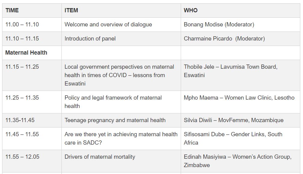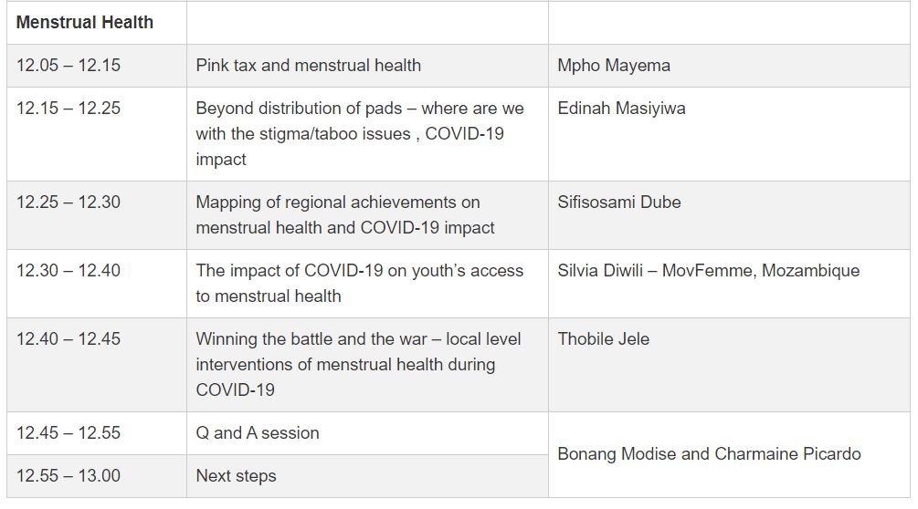 Ce mercredi 8 septembre, Gender Links, Southern Africa Gender Protocol Alliance et la SAFAIDS organisent une discussion virtuelle sur la maternité et la menstruation. Le rendez-vous est pris pour 11 heures sur Gender Links Zoom Meeting. Cette rencontre virtuelle se fait dans le cadre de la SADC Gender Protocol Barometer 2020 qui vient d’être publiée.