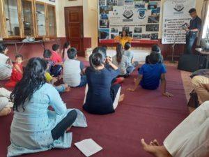 À son arrivée, vers 14h15, au centre social de l’Escalier, Acharya Pratishtha Saraswat a fait une visite des lieux pour contempler les chefs-d’œuvre de ces enfants qui sont, selon elle, la génération de demain. À 15 heures, elle a eu l’honneur d’allumer la lampe, puis elle s’est rendue dans le hall principal où elle a commencé l’atelier de yoga : Why Yoga, When Yoga, durant lequel elle a mis l’accent sur les bienfaits physiques et mentaux du yoga sur la santé des individus.
