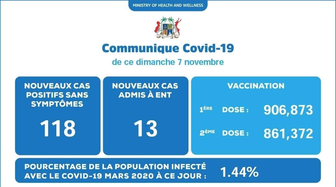 Un total de 131 nouveaux cas a été enregistré ce dimanche 7 novembre. On retrouve 118 cas sans symptômes et 13 qui ont été admis à l’ENT.