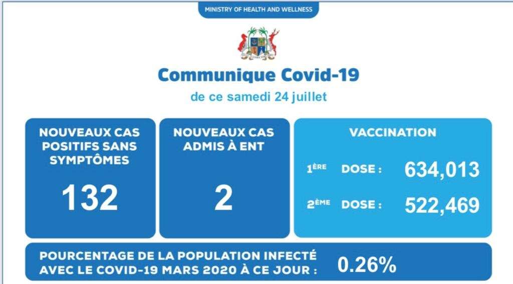 Covid-19 : 132 cas sans symptômes et 2 cas admis à ENT (samedi 24 juillet)