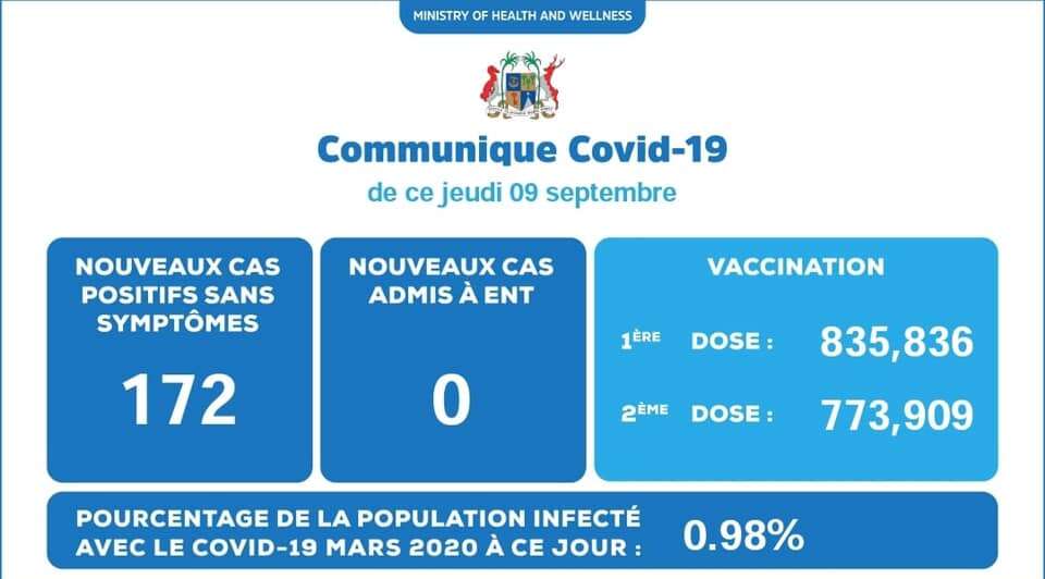 Le ministère de la Santé indique qu’il y a eu 172 nouvelles contaminations à la Covid-19 ce jeudi 9 septembre. Tous sont sans symptômes et aucun nouveau cas n’a été admis au New ENT Hospital aujourd’hui.