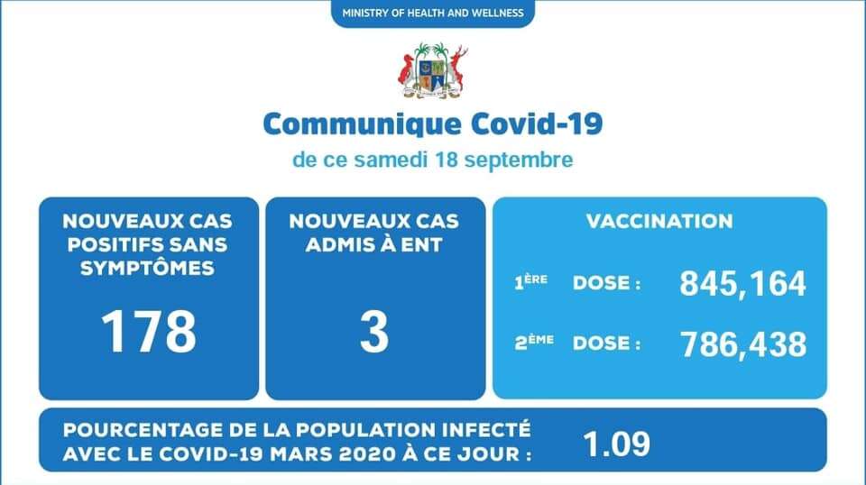 Ce samedi 18 septembre, le pays a enregistré un total de 181 cas de Covid-19. Parmi, 178 cas sont asymptomatiques alors que trois cas ont été admis au New ENT Hospital.