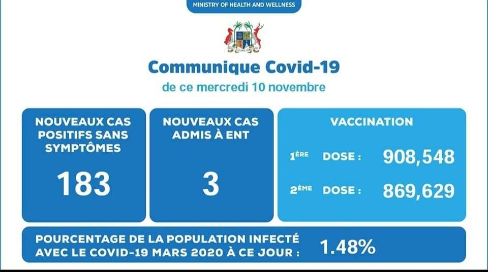 Le ministère de la Santé fait état de 186 nouvelles contamination ce mercredi 10 novembre. Parmi, on retrouve 183 cas asymptomatiques alors que 3 ont été admis à ENT.