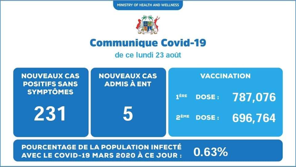 Le ministère de la Santé indique qu’il y a eu 231 nouvelles contamination sans symptômes ce lundi 23 août. Cependant, cinq autre nouveaux cas ont été admis au New ENT Hospital.