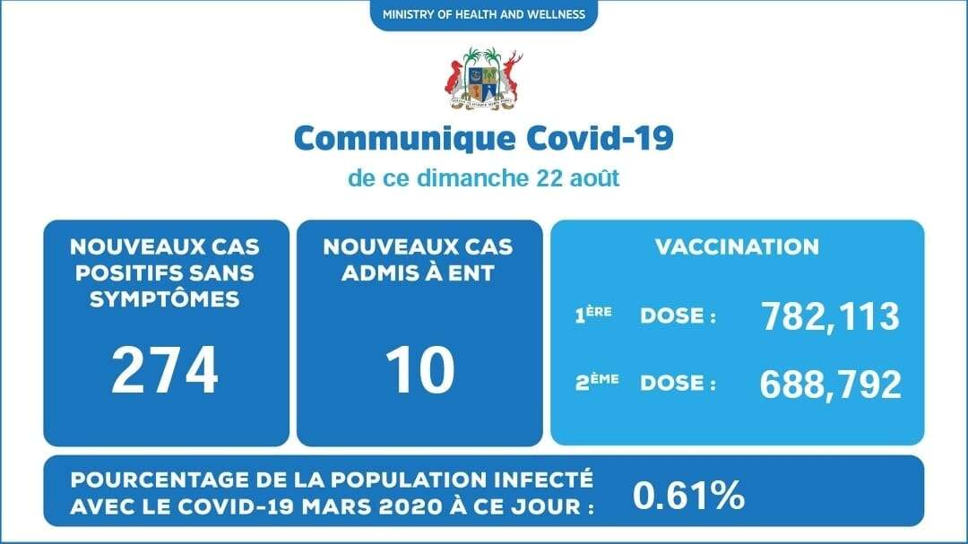 Les chiffres de ce dimanche 22 août comprennent 274 nouveaux cas de Covid-19 mais qui ne représentent pas de symptômes. Par contre, il y a eu dix nouveaux cas admis au New ENT Hospital.