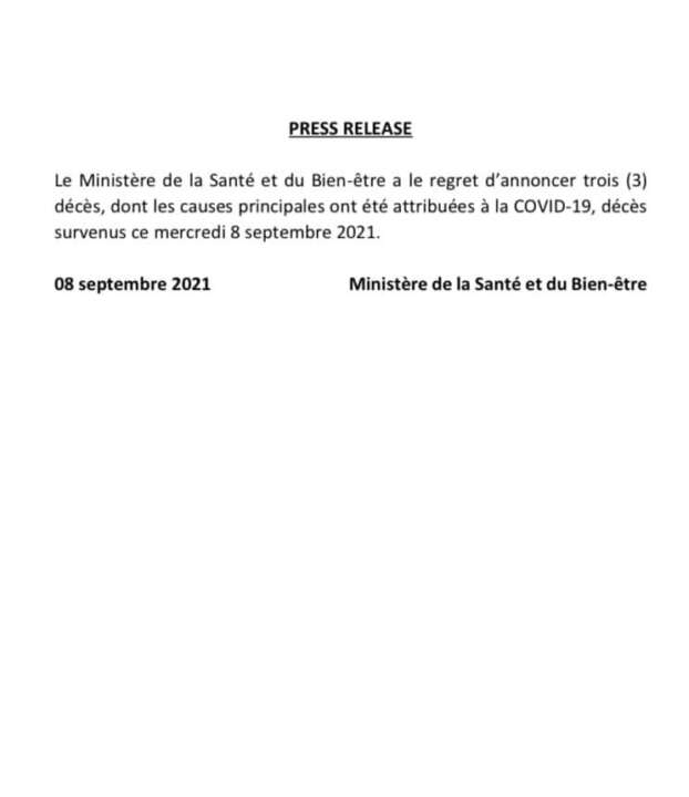 Le ministère de la Santé vient d’informer qu’il y a eu trois nouveaux décès survenus ce mercredi 8 septembre. Les causes principales ont toutes été attribuées à la Covid-19.
