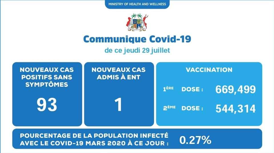 Le bilan de ce jeudi 29 juillet fait état de 93 nouveaux cas positifs de Covid-19 sans symptômes selon le communiqué de presse émis par le ministère de la Santé. Aussi, un nouveau cas a été admis à ENT.