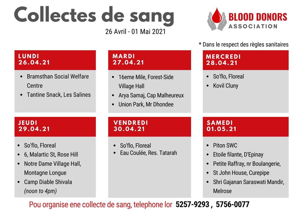 Les collectes de sang se poursuivent à travers l’île. Un calendrier hebdomadaires est proposé par la Blood Donors Association permettant aux Mauriciens de se mobiliser. Et, ce lundi 26 avril, deux dons de sang sont prévus notamment à Les Salines et à Bramsthan.