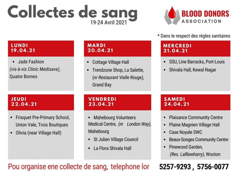 L’équipe de la Banque de Sang et la Blood Donors Association était à Quatre-Bornes ce lundi 19 avril et un total de 26 pintes de sang ont été collectées. L’exercice continue demain, mardi 20 avril avec deux collectes de sang prévues à Cottage et Grand Baie.