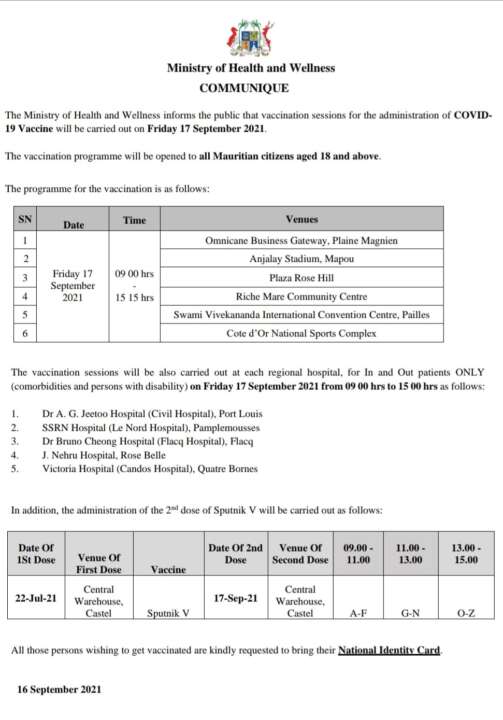Un total de six centres de vaccination sera opérationnel ce vendredi 17 septembre. C’est ce qu’a fait ressortir le ministère de la Santé à travers un communiqué de presse. De plus, les cinq hôpitaux régionaux ont également prévu de faire vacciner les Mauriciens.